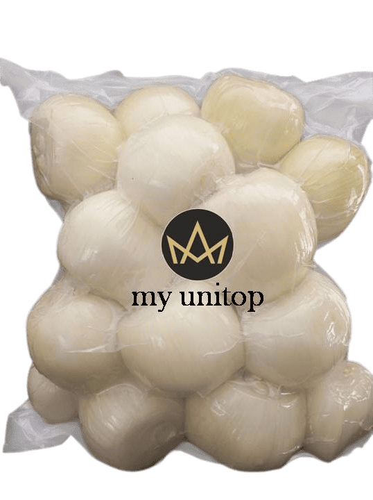 Κρεμμύδια άσπρα καθαρισμένα σε συσκευασία vacuum των 5kg.